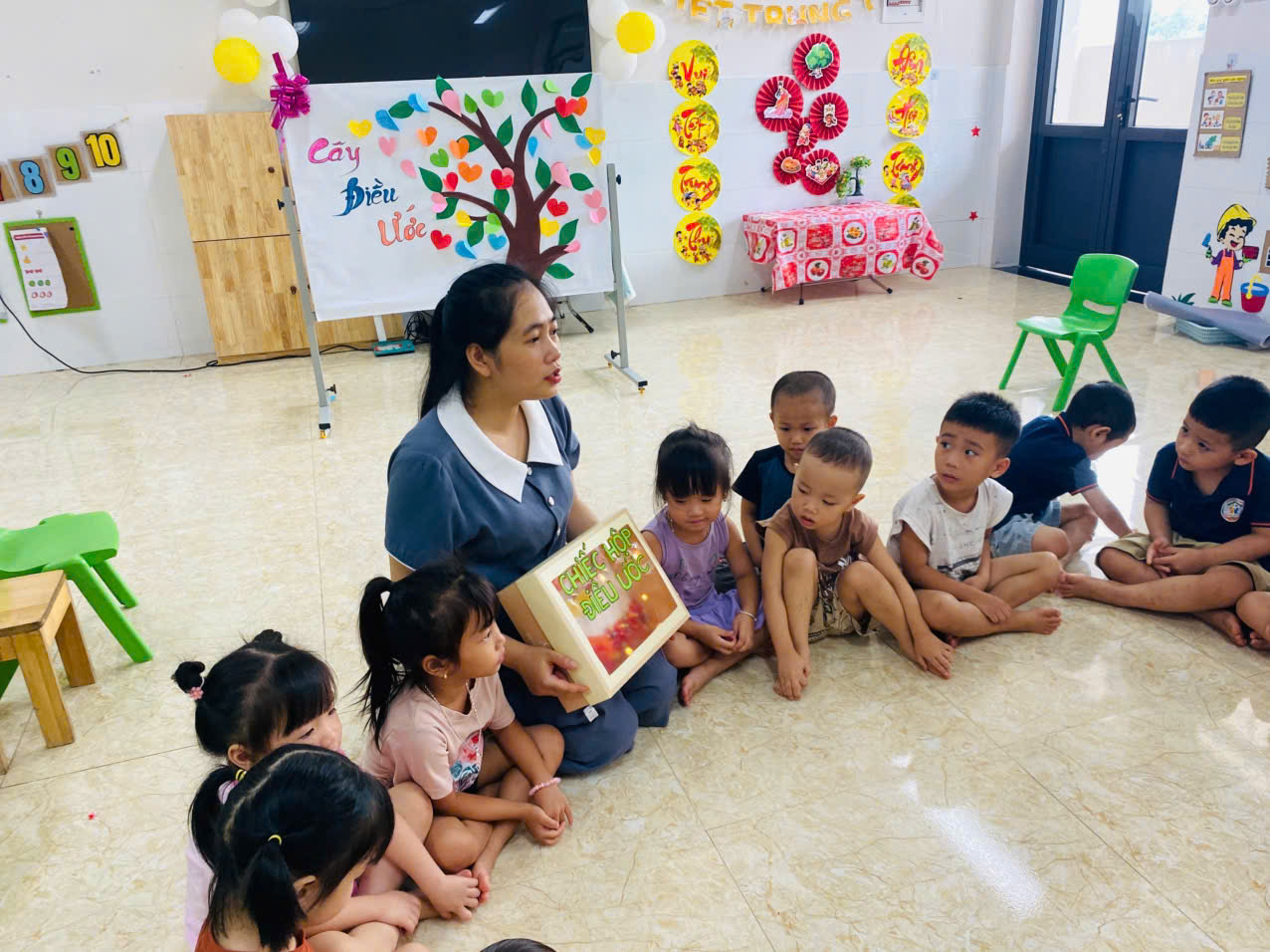 17/10/2025 A- A A+ | LQVH Truyện Chiếc hộp điều ước lớp 4 tuổi B1 hà.docx Xem Chia s? GIÁO ÁN DỰ GIỜ Đề tài: Truyện “Chiếc hộp điều ước” Đối tượng: Trẻ 4-5 Tuổi Chủ Đề: 20/10 - Ngày phụ nữ Việt Nam Thời gian: 25 – 30 phút Người thực hiện: Vương Thị Thu Hà I.Mục đích -Yêu cầu. 1. Kiến thức - Trẻ nhớ tên truyện “Chiếc hộp điều ước”, biết các nhân vật (An, mẹ, chú chim). - Hiểu nội dung: An có ba điều ước, nhưng điều ước ý nghĩa nhất là mong mẹ khỏe mạnh, hạnh phúc. - Nhận ra bài học: Điều ước đẹp nhất là dành cho những người thân yêu. 2. Kỹ năng - Rèn khả năng chú ý, lắng nghe, ghi nhớ và kể lại chi tiết đơn giản của truyện. - Phát triển tư duy dự đoán, trả lời mạch lạc, diễn đạt cảm xúc bằng lời. - Biết bày tỏ tình cảm với mẹ, bà, cô qua lời chúc, điều ước. 3. Thái độ – Giáo dục - Hình thành tình yêu thương, kính trọng mẹ, bà, cô. - Biết quan tâm, chia sẻ niềm vui với người thân, không chỉ nghĩ cho bản thân. - Tạo cho trẻ niềm vui, sự tự tin khi thể hiện lời chúc trong ngày 20/10. II.Chuẩn bị 1. Đồ dùng của cô -trình chiếu minh họa các nhân vật và tình tiết trong truyện (An, mẹ, chú chim, chiếc hộp, đồ chơi, bánh kẹo…). - Mô hình “Chiếc hộp điều ước” được trang trí đẹp, lung linh. - Nhạc nền phù hợp:Kiss The Ran “Nhật ký của mẹ”, “Bông hồng tặng cô”, “ - Cây điều ước để trẻ dán hoa/lời chúc. - Tạp rề kể truyện - khung chiếu bóng rối 2. Đồ dùng của trẻ - Mỗi trẻ một bông hoa hoặc thiệp nhỏ để viết/lời chúc. - Ghế ngồi ngay ngắn, tạo vòng tròn để dễ quan sát và tham gia. 3. Địa điểm - Lớp học sạch sẽ, thoáng mát, III.Cách tiến hành 1. Ổn định – Gây hứng thú (3’) - Cô tay cầm chiếc hộp lung linh, giới thiệu: “Các con ơi, hôm nay cô mang đến lớp một chiếc hộp rất đặc biệt. - Các con đoán xem trong hộp này có gì?” - Khích lệ trẻ đoán. - Cô: “Đây không phải hộp quà bình thường đâu, mà là Chiếc hộp điều ước. Các con có muốn nghe câu chuyện kỳ diệu về chiếc hộp này không?” 2. Hoạt động chính (20’) a. Cô kể lần 1 (bằng lời): trình chiếu tivi - Giọng kể dịu dàng, cảm xúc: . b. Cô kể lần 2 Kể truyện trên tạp dề (kết hợp hình ảnh, hỏi trẻ dự đoán): - Cô: “Điều ước thứ nhất, An đã viết gì nhỉ? Các con thử đoán xem?”. - Cô tiếp tục: “Đến điều ước thứ hai, An viết gì nhỉ?” - Cô: “Đúng vậy! Bánh kẹo đầy nhà, nhưng ăn nhiều quá thì An đau bụng, còn mẹ thì lo lắng chạy tìm thuốc.” - (Giọng chậm rãi, xúc động, nhạc nền ngân vang): “An hiểu ra, những điều ước ấy chỉ làm mình vui một chút thôi, còn mẹ thì vẫn vất vả. An đã lấy mảnh giấy cuối cùng và viết: Con ước mẹ của con luôn khỏe mạnh, vui vẻ và hạnh phúc.” - (Mở hộp, ánh sáng lung linh phát ra – tạo cao trào). c. Đàm thoại – Trò chuyện với trẻ: - Cô hỏi: “Trong truyện có những nhân vật nào?” - “Bạn An đã có mấy điều ước?” - “Điều ước nào làm mẹ vui nhất?” - “Nếu con có một chiếc hộp điều ước, con sẽ ước điều gì cho mẹ/bà/cô?” d. Kể truyện với khung rối bóng: - Hỏi trẻ về điều ước… - Cô chốt: “Điều ước đẹp nhất không phải dành cho riêng mình, mà là mang hạnh phúc cho những người chúng ta yêu thương. Đặc biệtsắp tới ngày 20/10 ,ngày của bà, mẹ, cô chúng mình hãy dành cho họ những điều tuyệt vời nhất nhé. 3. Hoạt động bổ sung – Trải nghiệm sáng tạo (7’) - Phát hoa/thiệp cho trẻ. - Cô: “Bây giờ, mỗi bạn sẽ có một bông hoa điều ước. Các con hãy nói một lời chúc, một điều ước dành cho mẹ, bà, cô rồi dán hoa lên Cây điều ước yêu thương.” - Mở nhạc “Nhật kí của mẹ" 4. Kết thúc (2’) - Cô: “Cô rất vui vì hôm nay các con đã nghe truyện thật chăm chú, đã biết dành điều ước đẹp cho người thân. Cô tin rằng bà, mẹ, cô sẽ xúc động lắm khi nghe những lời chúc này. Trước khi ra về, các con nhớ ôm mẹ một cái và nói: ‘Con yêu mẹ nhiều lắm’ nhé!” - Cùng cả lớp hát “Bông hông tặng cô". Tập tin đính kèm Tải về