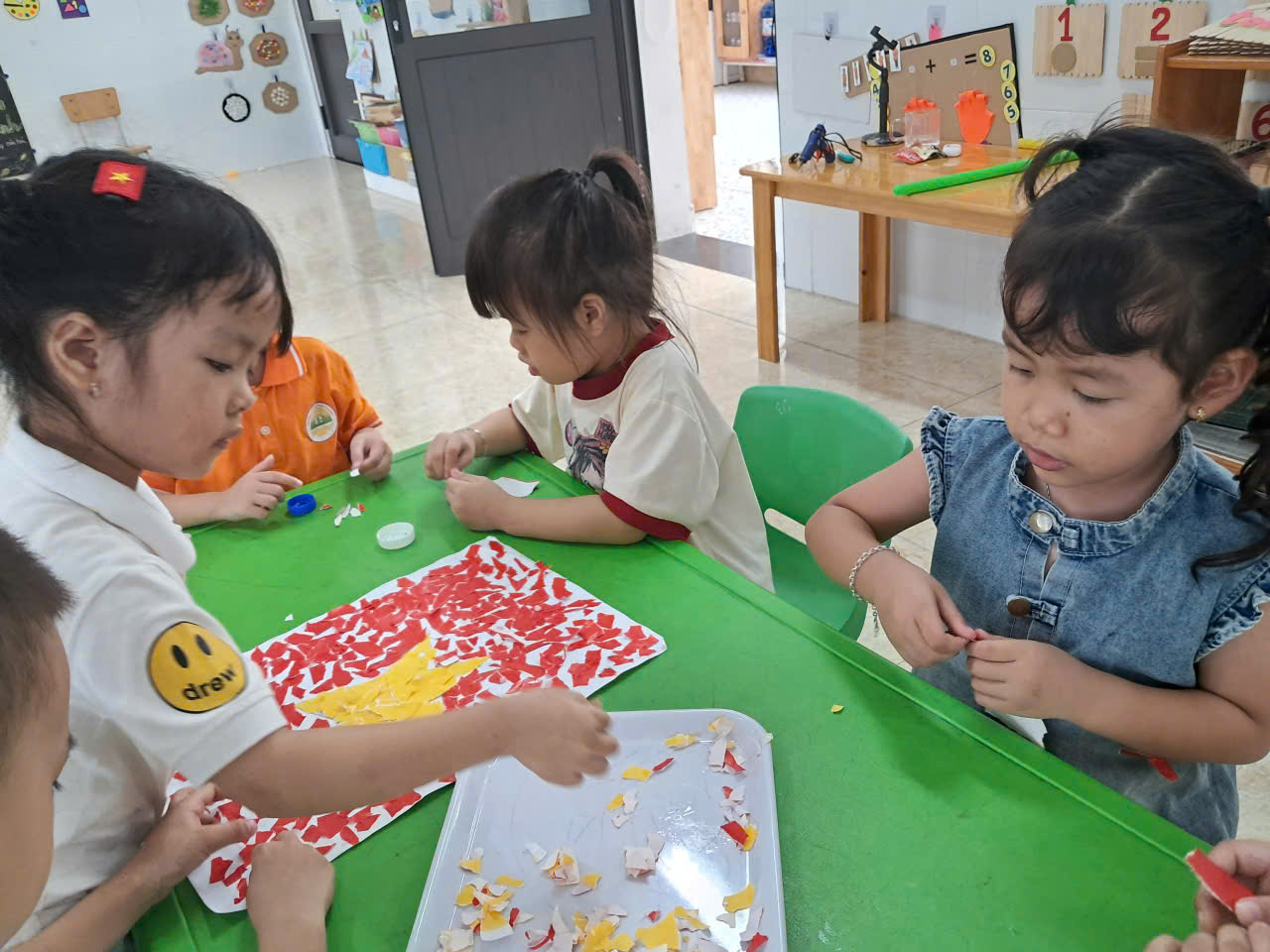 01/09/2025 A- A A+ | HOẠT ĐỘNG XÉ DÁN TẠO HÌNH LÁ CỜ LỚP 5TA4 Xem Chia s? HOẠT ĐỘNG XÉ DÁN TẠO HÌNH LÁ CỜ CHÀO MỪNG QUỐC KHÁNH 2/9 Hòa trong không khí tưng bừng cả nước kỷ niệm Quốc khánh 2/9, các bé lớp 5 tuổi A4 – Trường Mầm non Hợp Thanh đã có một hoạt động trải nghiệm vô cùng ý nghĩa: xé dán tạo hình lá cờ Tổ quốc. Ngay từ đầu giờ, cô giáo trò chuyện cùng các con về ý nghĩa ngày 2/9 – ngày Bác Hồ đọc Tuyên ngôn Độc lập, khai sinh ra nước Việt Nam Dân chủ Cộng hòa. Qua đó, trẻ thêm tự hào và háo hức chuẩn bị cho hoạt động tạo hình. Với những tờ giấy màu đỏ, vàng được cô chuẩn bị, các bé say sưa xé những mảnh giấy nhỏ rồi khéo léo dán lên giấy nền để tạo thành lá cờ đỏ sao vàng rực rỡ. Bàn tay nhỏ xinh thoăn thoắt, ánh mắt chăm chú, nụ cười rạng rỡ… tất cả làm nên một không khí hăng say, sáng tạo. Hoạt động không chỉ rèn luyện cho trẻ sự khéo léo, kiên trì, kỹ năng xé – dán mà còn bồi dưỡng tình yêu quê hương, đất nước. Khi hoàn thành sản phẩm, các bé cùng nhau trưng bày, ngắm nhìn và hát vang bài hát “Như có Bác Hồ trong ngày vui đại thắng” trong niềm tự hào. Buổi học khép lại nhưng đã để lại nhiều ấn tượng đẹp trong lòng các con. Những lá cờ được làm bằng đôi bàn tay trẻ thơ chính là tình cảm trong sáng, ngây thơ mà các bé lớp 5 tuổi A4 gửi đến Tổ quốc nhân dịp kỷ niệm ngày lễ lớn. Sau đây là một số hình ảnh: Tập tin đính kèm Tải về