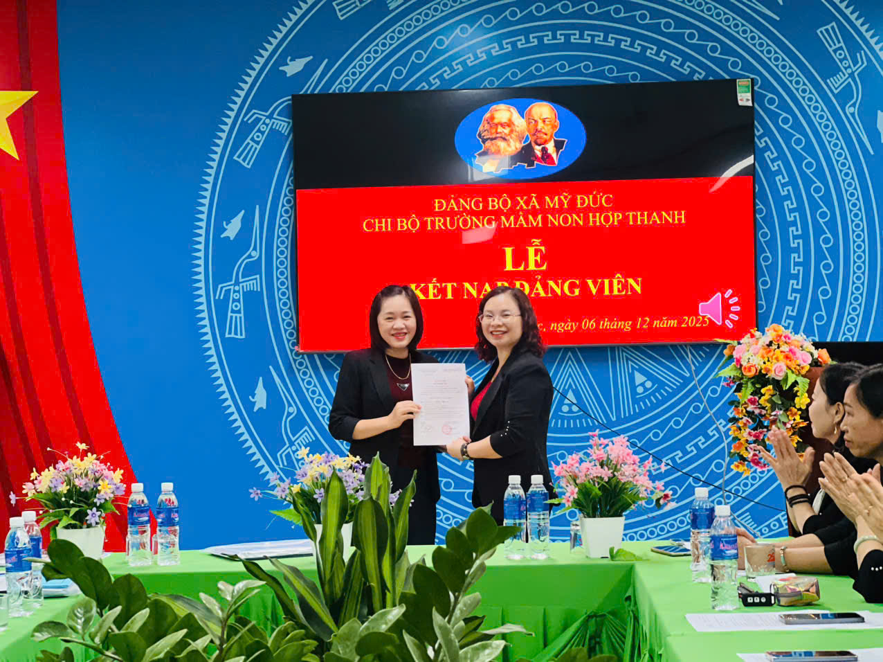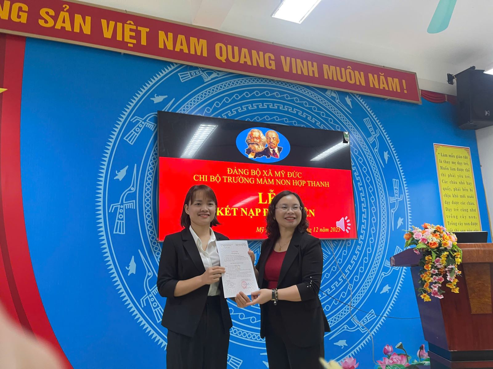 07/12/2025 A- A A+ | HỘI NGHỊ KIỂM ĐIỂM TẬP THỂ , CÁ NHÂN VÀ TỔNG KẾT CÔNG TÁC XÂY DỰNG ĐẢNG NĂM 2025 Xem Chia s? CHI BỘ TRƯỜNG MẦM NON HỢP THANH TỔ CHỨC LỄ KẾT NẠP ĐẢNG VIÊN MỚI, HỘI NGHỊ KIỂM ĐIỂM TẬP THỂ – CÁ NHÂN VÀ TỔNG KẾT CÔNG TÁC XÂY DỰNG ĐẢNG NĂM 2025 Thực hiện Điều lệ Đảng Cộng sản Việt Nam và kế hoạch công tác xây dựng Đảng năm 2025 của Đảng ủy xã Mỹ Đức, ngày 06/12/2025, Chi bộ Trường Mầm non Hợp Thanh đã long trọng tổ chức Lễ kết nạp đảng viên mới, Hội nghị kiểm điểm tập thể và cá nhân, đồng thời Tổng kết công tác xây dựng Đảng năm 2025. 1. Lễ kết nạp đảng viên mới Mở đầu chương trình, Chi bộ tổ chức Lễ kết nạp đảng viên mới cho hai quần chúng ưu tú: Đồng chí Nguyễn Thị Hương Đồng chí Nguyễn Thị Hồng Nhung Buổi lễ diễn ra trong không khí trang nghiêm, đúng quy định. Đồng chí Bí thư Chi bộ đã công bố Quyết định kết nạp đảng viên của Đảng ủy xã Hợp Thanh. Dưới cờ Đảng, cờ Tổ quốc và chân dung Chủ tịch Hồ Chí Minh, hai đồng chí đã đọc lời tuyên thệ, thể hiện quyết tâm phấn đấu, rèn luyện, hoàn thành tốt nhiệm vụ của người đảng viên mới. Chi bộ giao nhiệm vụ và phân công đảng viên chính thức tiếp tục giúp đỡ hai đồng chí trong thời gian dự bị, tạo điều kiện để hai đồng chí phát huy năng lực, đóng góp vào công tác chung của nhà trường. 2. Hội nghị kiểm điểm tập thể và cá nhân năm 2025 Ngay sau lễ kết nạp, Chi bộ tiến hành Hội nghị kiểm điểm tập thể và cá nhân đảng viên năm 2025. Tại hội nghị: Tập thể Chi bộ đã báo cáo kiểm điểm theo các tiêu chí: công tác lãnh đạo nhiệm vụ chuyên môn; sinh hoạt chi bộ; công tác phát triển đảng; thực hiện quy chế dân chủ; công tác kiểm tra, giám sát; việc học tập và làm theo tư tưởng, đạo đức, phong cách Hồ Chí Minh. Từng đảng viên nghiêm túc tự kiểm điểm về tư tưởng chính trị, đạo đức lối sống, tinh thần trách nhiệm, ý thức tổ chức kỷ luật, kết quả thực hiện nhiệm vụ được giao và việc nêu gương. Các ý kiến đóng góp trong hội nghị được thực hiện dân chủ, thẳng thắn, mang tính xây dựng. Chi bộ đã bỏ phiếu xếp loại đảng viên năm 2025 đảm bảo khách quan, công bằng và đúng quy định. 3. Tổng kết công tác xây dựng Đảng năm 2025 Chi bộ đã tiến hành đánh giá toàn diện kết quả công tác xây dựng Đảng năm 2025, nổi bật gồm: Duy trì tốt nền nếp sinh hoạt chi bộ và sinh hoạt chuyên đề. Lãnh đạo, chỉ đạo thực hiện hiệu quả nhiệm vụ chăm sóc – giáo dục trẻ, nâng cao chất lượng đội ngũ. Thực hiện nghiêm túc việc học tập và làm theo tư tưởng, đạo đức, phong cách Hồ Chí Minh. Công tác phát triển Đảng đạt kết quả tích cực với 02 đảng viên mới được kết nạp. Công tác kiểm tra, giám sát, dân vận, quy chế dân chủ được thực hiện bài bản, đúng kế hoạch. Nội bộ đoàn kết, trách nhiệm, tinh thần nêu gương của đảng viên tiếp tục được phát huy. Phương hướng công tác năm 2026, Chi bộ tập trung vào: Tiếp tục nâng cao chất lượng sinh hoạt chi bộ. Đẩy mạnh chuyển đổi số trong công tác Đảng và chuyên môn. Tăng cường kỷ luật, kỷ cương, trách nhiệm và tinh thần nêu gương của từng đảng viên. Bồi dưỡng, tạo nguồn và phát triển đảng viên mới. Buổi lễ và hội nghị diễn ra trang trọng, nghiêm túc và hiệu quả, thể hiện tinh thần đoàn kết, trách nhiệm của tập thể Chi bộ Trường Mầm non Hợp Thanh. Đây là dấu mốc quan trọng, góp phần nâng cao năng lực lãnh đạo và sức chiến đấu của Chi bộ, tạo động lực để hoàn thành tốt nhiệm vụ năm học và công tác xây dựng Đảng trong thời gian tới. Tập tin đính kèm Tải về