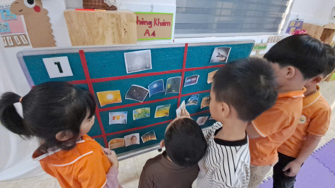 01/05/2025 A- A A+ | KPKH Tìm hiểu về ánh sáng lớp 5TA4 Xem Chia s? Khám phá: KPKH: Sự kỳ diệu của ánh sáng CÁC YẾU TỐ STEAM - S: Khoa học: Trẻ biết nguồn gốc của ánh sáng tự nhiên và ánh sáng nhân tạo,lợi ích và tác hại của các loại ánh sáng đối với cuộc sống của con người. +Trẻ biết quan sát,khám phá,đặt câu hỏi thảo luận,chia sẻ về kết quả khám phá các nguồn ánh sáng. - T: Công nghệ: Trẻ biết sử dụng công cụ, dụng cụ khi khám phá ( đèn pin,kính...) - E: Kỹ thuật: Thao tác kỹ thuật như cầm đèn pin để chiếu vào vật tạo ra bóng,đổi màu ánh sáng, viết lại, chép lại,.. - A: Nghệ thuật:Trẻ trải nghiệm hiệu ứng màu sắc khi có ánh sáng chiếu vào.Trẻ sáng tạo ra các vũ điệu cơ thể với âm nhạc,sử dụng đôi bàn tay tạo hình các con vật ,biết con người dùng ánh sáng để làm môn múa bóng. - M: Toán: Trẻ nhận biết sự to nhỏ của bóng II.Chuẩn bị * Chuẩn bị của cô: - Giáo án - Máy tính, máy chiếu, phông, nhạc chơi trò chơi * Chuẩn bị của trẻ: -2 khung chiếu bóng -2 chiếc bảng, một số hình ảnh về các loại ánh sáng và tác dụng ánh sáng - 14 bóng đèn ( Đèn pin, đèn tích điện) - 4 chiếc cốc có nước. - Một số ống bằng giấy màu. - Kính màu - Trẻ trang phục gọn gàng, sạch sẽ hợp thời tiết. III.Cách tiến hành 1:Gắn kết (E1) - Giới thiệu chương trình “Bé vui khám phá” - Giới thiệu khách (Cô 2 kéo rèm, khép cửa, tắt điện) * Trò chơi: Tạo bóng các con vật: - Cô 2 tạo bóng các con vật bằng bàn tay cho trẻ quan sát +Hỏi trẻ đây là con gì? + Con vật đó đang làm gì?...... +Các con thấy những hình con gì? +Vậy tại sao lại có bóng tay in trên phông? Cô khái quát: Ánh sáng giúp chúng ta có thể tạo hình các con vật bằng bàn tay. Ánh sáng còn có nhiều điều kỳ diệu khác nữa cô cùng các con khám phá nhé. (Cô 2 bật điện,kéo rèm, mở cửa) 2.Khám phá (E2); * Tìm hiểu về các loại ánh sáng: - Hôm qua cô con mình trò chuyện về điều gì? -Cô chia trẻ thành 3 nhóm -Cô nêu yêu cầu cho trẻ thực hiện.Các nhóm sẽ lấy đồ dùng khám phá ánh sáng về nhóm và thảo luận xem có những nguồn ánh sáng nào? tác dụng của ánh sáng là gì và tác hại như thế nào ? Sau khi các nhóm thảo luận xong sẽ cử 1 bạn đại diện nhóm lên trình bày nội dung của nhóm mình. -Trong khi các nhóm khám phá cô bao quát,đặt câu hỏi gợi mở,thăm dò và kích thích trẻ chia sẻ,khám phá,tìm kiếm. 3.Giải thích (E3) : - Cô mời đại diện từng nhóm lên chia sẻ về bảng khảo sát của nhóm mình -Cô đặt câu hỏi gợi ý, kích thích trẻ chia sẻ về những điều trẻ khám phá được. -Con hãy chia sẻ cho cô và các bạn biết về những điều các con vừa khám phá. -Các nhóm có ý kiến gì bổ sung không? -Theo các con,chúng ta phải làm gì để ứng phó với tác hại của ánh nắng mặt trời? -Tích hợp giáo dục trẻ ứng phó với biến đổi khí hậu (không ra ngoài trời khi nắng gay gắt,phải đội mũ nón ,sử dụng tiết kiệm điện nước) -Cô mời các nhóm còn lại lên chia sẻ =>Cô tổng hợp ý kiến: (Sử dụng công nghệ Al):Có rất nhiều nguồn ánh sáng xung quanh chúng ta, có nguồn sáng tự nhiên và ánh sáng do con người tạo ra.Nguồn sáng tự nhiên là tự nhiên mà có như: Ánh sáng mặt trời, mặt trăng và các ngôi sao, ánh sáng từ con đom đóm..... -Lợi ích cua Ánh sáng tự nhiên giúp chúng ta nhìn mọi vật dễ hơn, Phơi khô đồ, làm cây cối phát triển, ánh nắng còn sưởi ấm cho con người,giúp con người sảng khoái khỏe mạnh hơn.Ánh sáng tự nhiên vào buổi sáng giúp chúng ta tổng hợp vita min D tốt cho xương.ánh sáng ttuwj nhiên giúp cây cối phát triển... -Tác hại của ánh sáng tự nhiên;anha sáng mặt trời chiếu quá cao khi đi ra ngoài trời sẽ làm cho chúng ta mệt mỏi,say nắng.Nắng gay gắt thời gian dài sẽ gây hạn hán,thiếu nước,cháy rừng. *Ánh áng nhân tạo là ánh sáng do con người tạo ra như đèn điện, đèn pin, đèn xe máy, đèn nến....Ánh sáng nhân tạo cũng giúp cho con người được nhìn thấy mọi vật dễ dàng hơn, dùng làm trang trí, dùng để thắp sáng căn phòng, thắp sáng khi trời tối.... -Tác hại của anh sáng nhân tạo:Nếu sử dụng ánh áng nhân tạo qúa mức như: xem tivi,điện thoại nhiều sẽ ảnh hưởng tới mắt ,ánh sáng quá thấp sẽ làm giảm thị lực,ánh sáng quá cao sẽ gây hại cho da *Giáo dục trẻ sử dụng và cách bảo vệ môi trường,bảo vệ bản thân dưới tác động của ánh sáng tự nhiên và ánh sáng nhân tạo 4.Áp dụng (E4): *Trải nghiệm sự đổi màu của ánh sáng: Trò chơi: Sắc màu kỳ diệu - Cho trẻ về 3 nhóm và đi lấy đồ dùng trải nghiệm. Mỗi nhóm 1 bàn, 1 rổ đồ dùng đựng1 đèn tích điện, 1 cốc nước, 3 ống giấy màu khác nhau. - Cho 1 trẻ cầm đèn lên và nắm chặt vào cổ bóng đèn. - Hỏi trẻ thấy điều gì xảy ra? - Cho trẻ để đèn tích điện xuống cốc có nước. - Ánh sáng có màu gì? * Cho trẻ thực nghiệm úp lần lượt những chiếc ống giấy vào đèn và quan sát ánh sáng? - Vậy khi úp ống giấy màu vào bóng đèn thì các con th